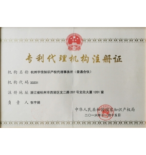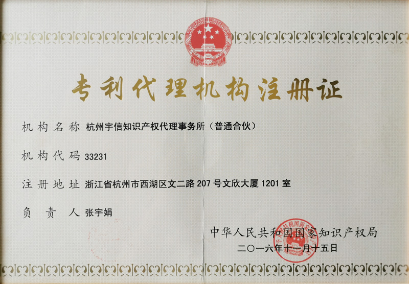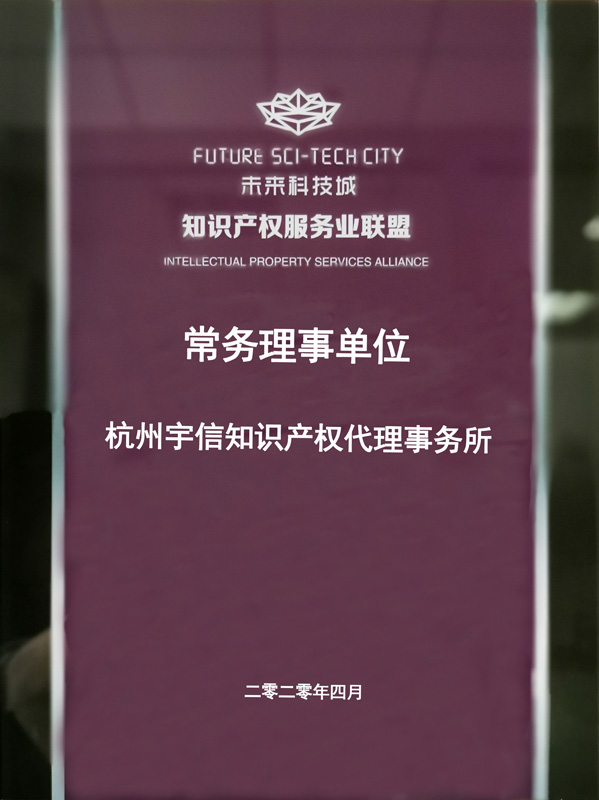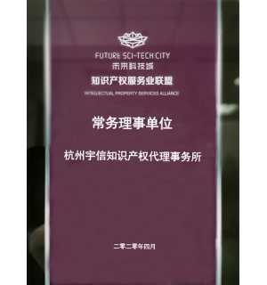 Hangzhou Yuxin Intellectual Property Office is a national star-rated patent agency, ranked in Zhejiang top 10 agencies serving small and medium-sized enterprises and Hangzhou top 10 agencies, and is a member of All-China Patent Attorneys Association, a standing member of Zhejiang Patent Attorneys Association, an allied unit of Hangzhou High-tech Industrial Development Zone (Binjiang) Intellectual Property Services, a standing member of Hangzou Future Sci-Tech City Intellectual Property Service Alliance, etc.